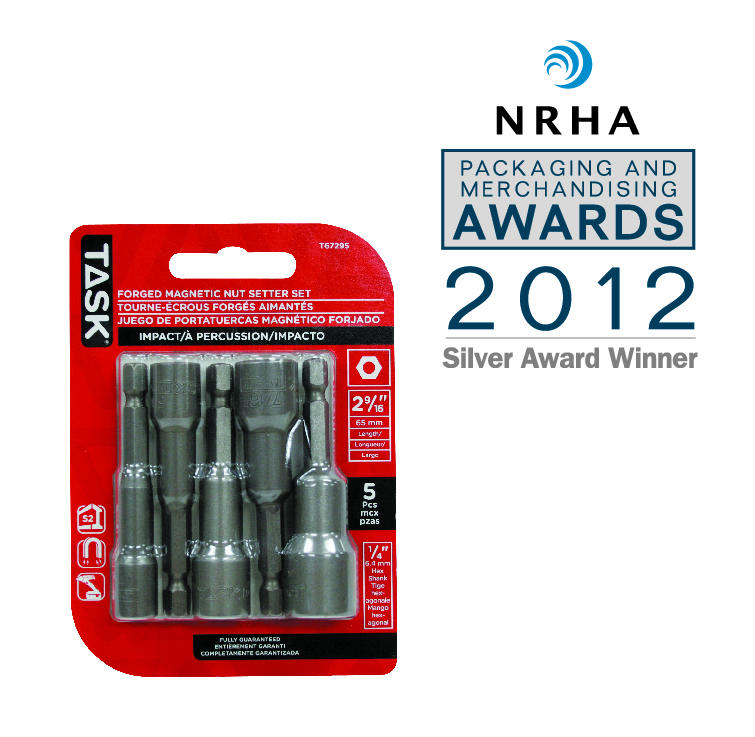 This 5-piece set features a captive blister that clearly displays the new TASK Impact Nutsetters. The package uses a bare minimum of material and takes up very little wall space while quickly conveying key information and selling features.